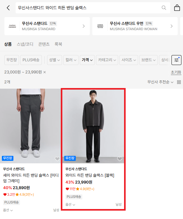 - 특징: 무신사 대표 인기 슬랙스. 히든 밴딩으로 너무 편하며 재구매율 98%! 저도 또 구매해요!