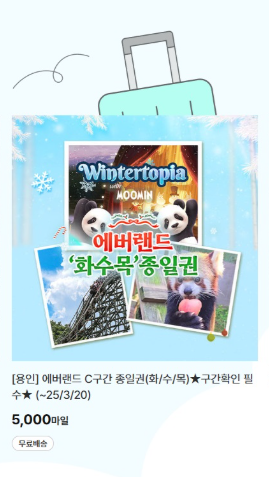- OZ마일샵: 보통 숙박이나 테마파크(에버랜드) 예약을 많이 하시죠. 하지만 항상 품절 상태입니다. 단, 숙박과 테마파크 모두 매주 화/목요일 오전 10시에 수량이 오픈됩니다. 실제로 아래와 같이 뜨더라구요. 해당 시간에 대기하고 있다가 빠르게 예약하시면 됩니다.