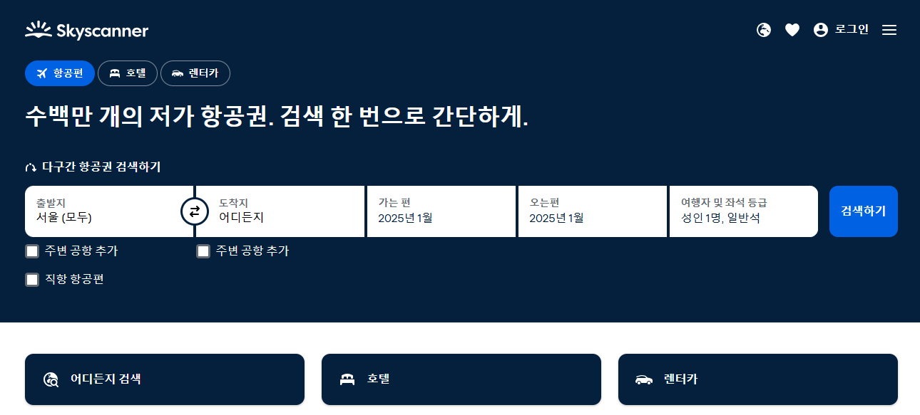 스카이스캐너에 접속하면 아래와 같은 화면이 나옵니다.