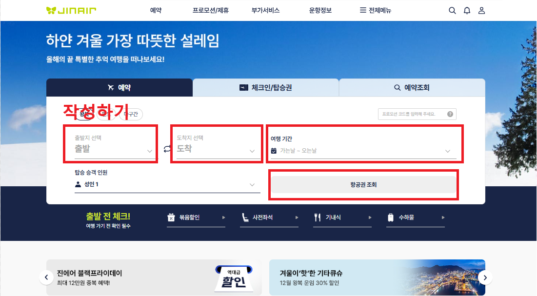 진에어 항공권 조회하기를 하면 아래와 같은 첫 화면이 나옵니다.
